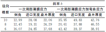 通過最小二乘法對各曲線進行線性擬合,獲得各擬合曲線的斜率b值,即可比較各參數在各自變化范圍內對應力的影響程度,見表4。由表4可知,在各參數給定范圍內,倒角對應力的影響最小,而盤片厚度和進口寬度對應力的影響較為接近。