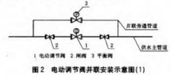 3)熱力站的初期供熱規模遠遠小于設計容量,且短期不能達到最終規模,1臺電動調節閥不能同時滿足初期和終期的供熱調節需求,這時可以有兩種辦法解決。方法一:先根據初期和中期的供熱負荷及運行參數計算出所需的流量,根據電動調節閥的選型原則進行選型,待熱負荷發展到超出該閥的調節范圍后,可另行選擇電動調節閥,此時以最終的供熱規模即設計容量為計算依據,選取適用的電動調節閥。此方法費用相對較高,且實施起來較為煩瑣。方法二:用帶有調節功能的平衡閥與電動調節閥并聯,各分擔一部分流量的調節功能(如圖2所示),這樣既可滿足初期的小流量調節要求,也可同時滿足終期的大流量調節要求,還能節約初投資,免去更換閥門的費用和精力。