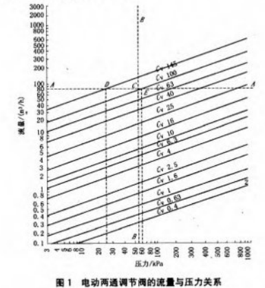 舉例如下。設計數據:系統流量80m3/h,系統壓降55kPa,圖1為調節閥的流量與壓力關系圖,圖中水平線A-A表示流量為80m3/h,垂直線B-B表示壓降為55kPa。