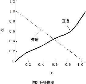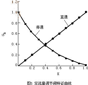 特征曲線包括直通曲線與旁通曲線,要實(shí)現(xiàn)定流量,兩條曲線可能有多種組合,但這兩條曲線組合并非是任意的,第一,要符合實(shí)際,即在制造工藝上是否可行;第二,要利于將來的調(diào)節(jié)。為有利于動態(tài)調(diào)節(jié),將直通曲線設(shè)為線性的,旁通曲線由直通的線性決定。即直通曲線為