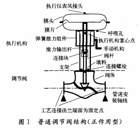 a)高溫(蒸汽介質)環境中,大多會出現填料泄漏故障,內件易損壞(閥芯閥座磨損失配、閥芯脫落),內部泄漏量大,不易控制,調節品質差,與工藝連接的法蘭端面很容易泄露等故障。圖1,圖2分別為普通調節閥和高溫型調節閥結構。從圖中可以看出,由于加了一截散熱器的距離,使用溫度越高散熱器就越長,因此,高溫型調節閥執行機構重心點距安裝軸線的距離,比普通型調節閥要長的多,非垂直安裝調節閥產生的力矩也要大得多。如:動力C鍋爐裝置的幾臺減溫減壓調節閥,合成氨裝置的調節閥等。