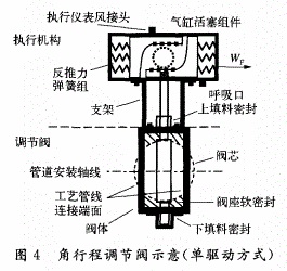 非垂直安裝的角行程調節閥(如圖4所示)如果連接對中失配,也會出現偏磨現象,但一般磨損較緩慢,損壞程度也較輕。一般只對上密封填料磨損,對下密封填料磨損較輕,總體上出現填料泄漏的情況并不多見。因此,直行程調節閥使用過程中出現填料泄漏問題的情況要更甚于角行程的調節閥。